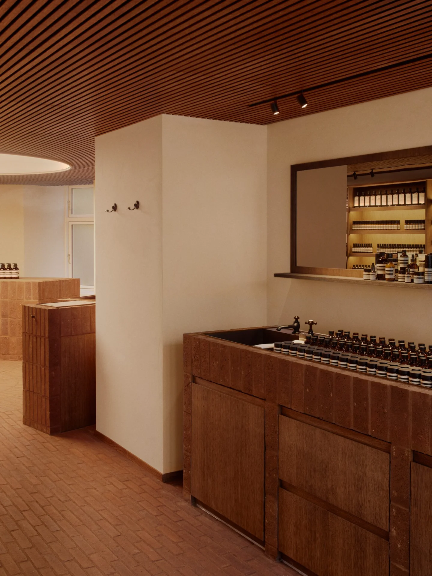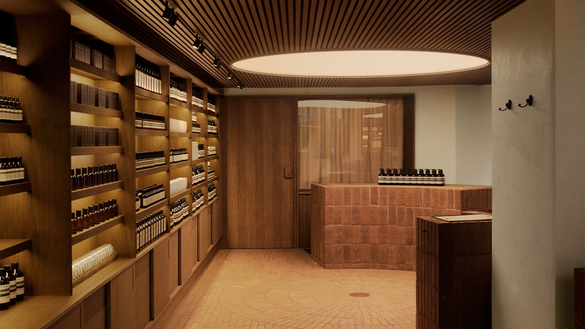 Earthen tones of stained oak, paving stones and darkened copper, we created a warmly enveloping experience for the exclusive skincare brand Aesop. A nod to nearby landmark the Louisiana Museum of Modern Art, we developed the freestanding counters and sinks and flooring pattern with master bricklayer Jens Østergaard. Curved walls and furniture radiate from the focal point of the shop, a massive illuminated disc reflected above a circular motif in the floor. A bespoke door to back-of-house and inbuilt shelving with integrated lighting made with custom veneer, CNC-shaped solid oak scent display - all wooden elements were drawn and built in-house. Custom steel entry door and copper sinks designed in-house and produced by local metalworkers.