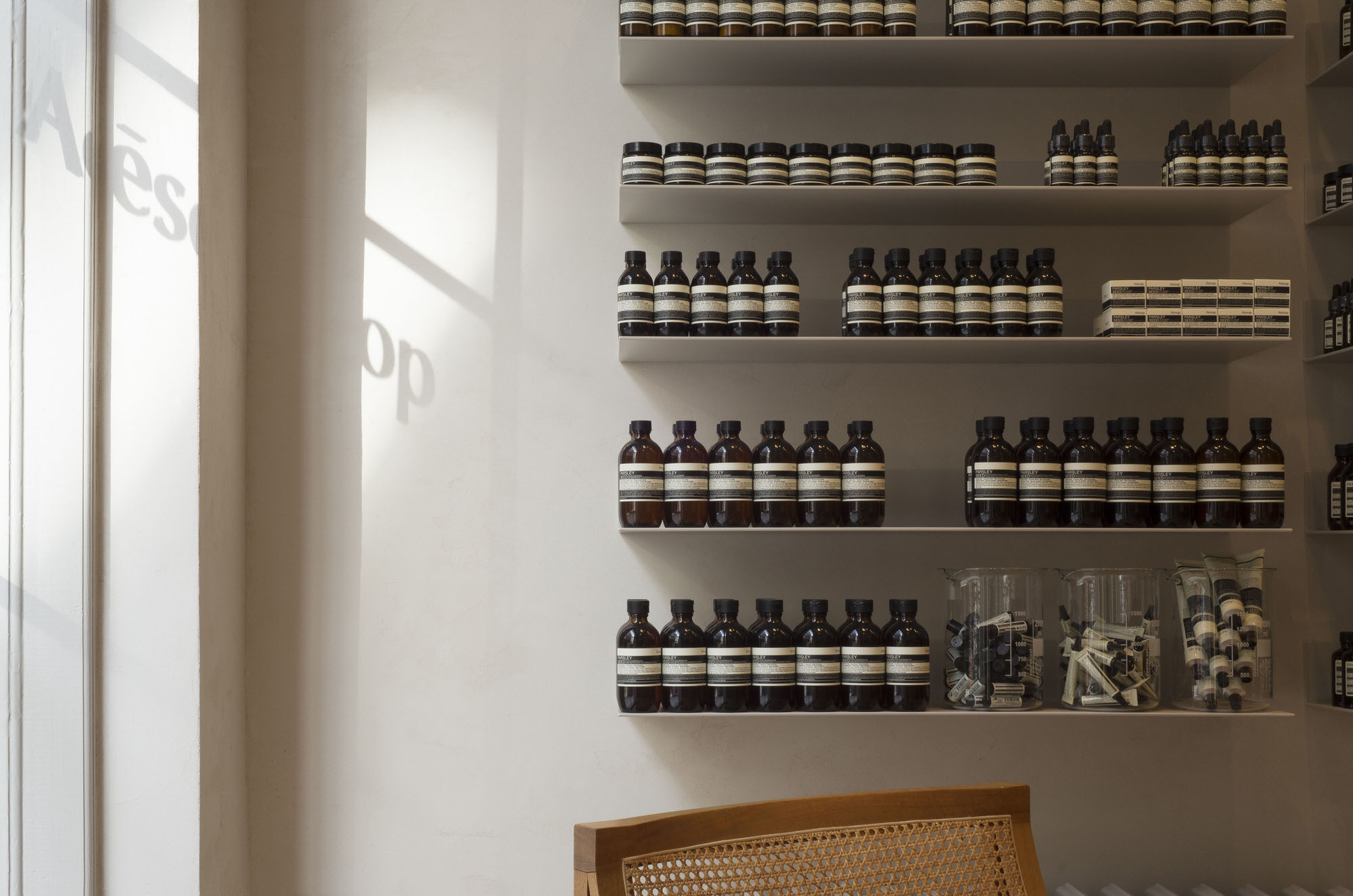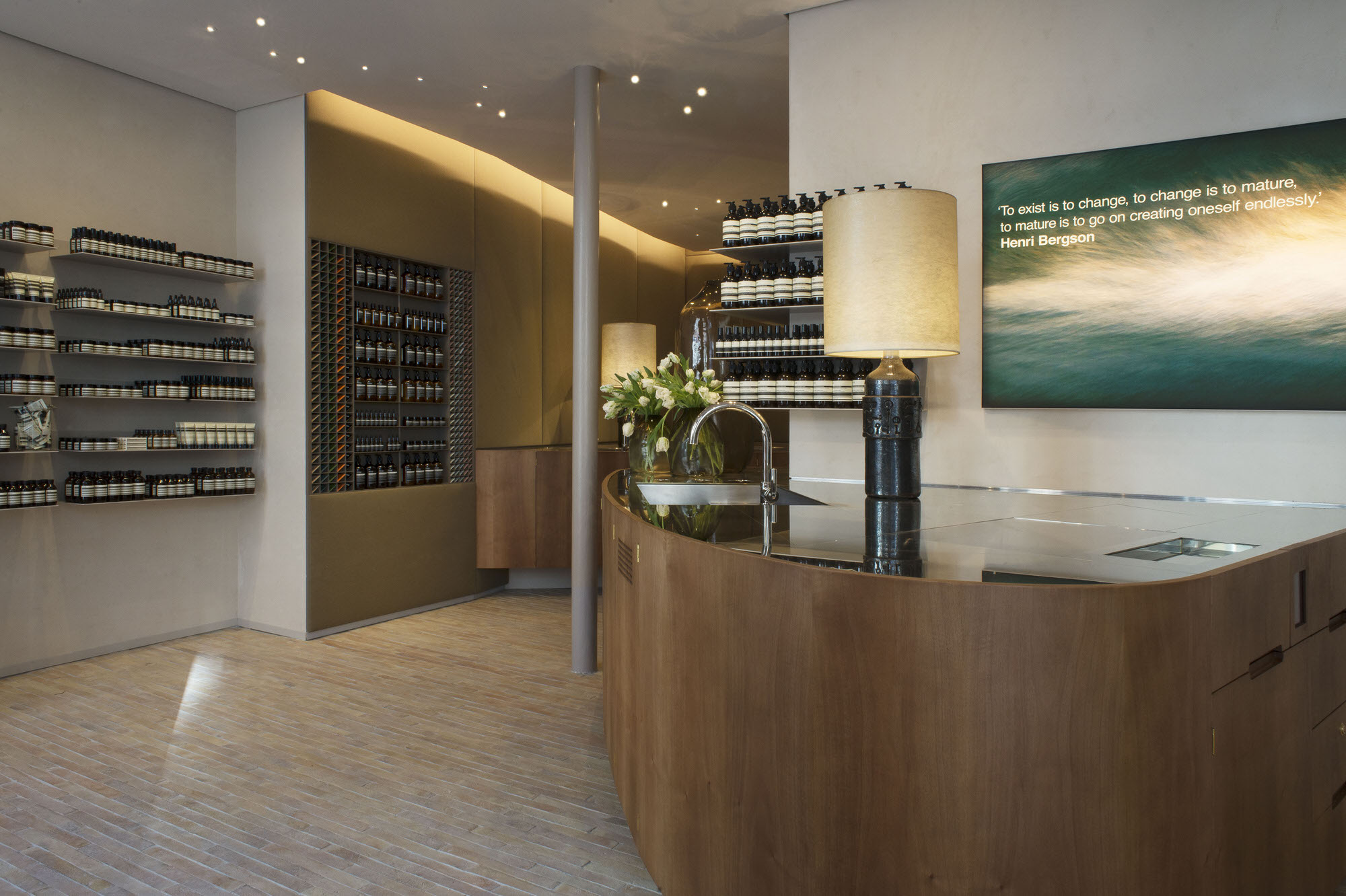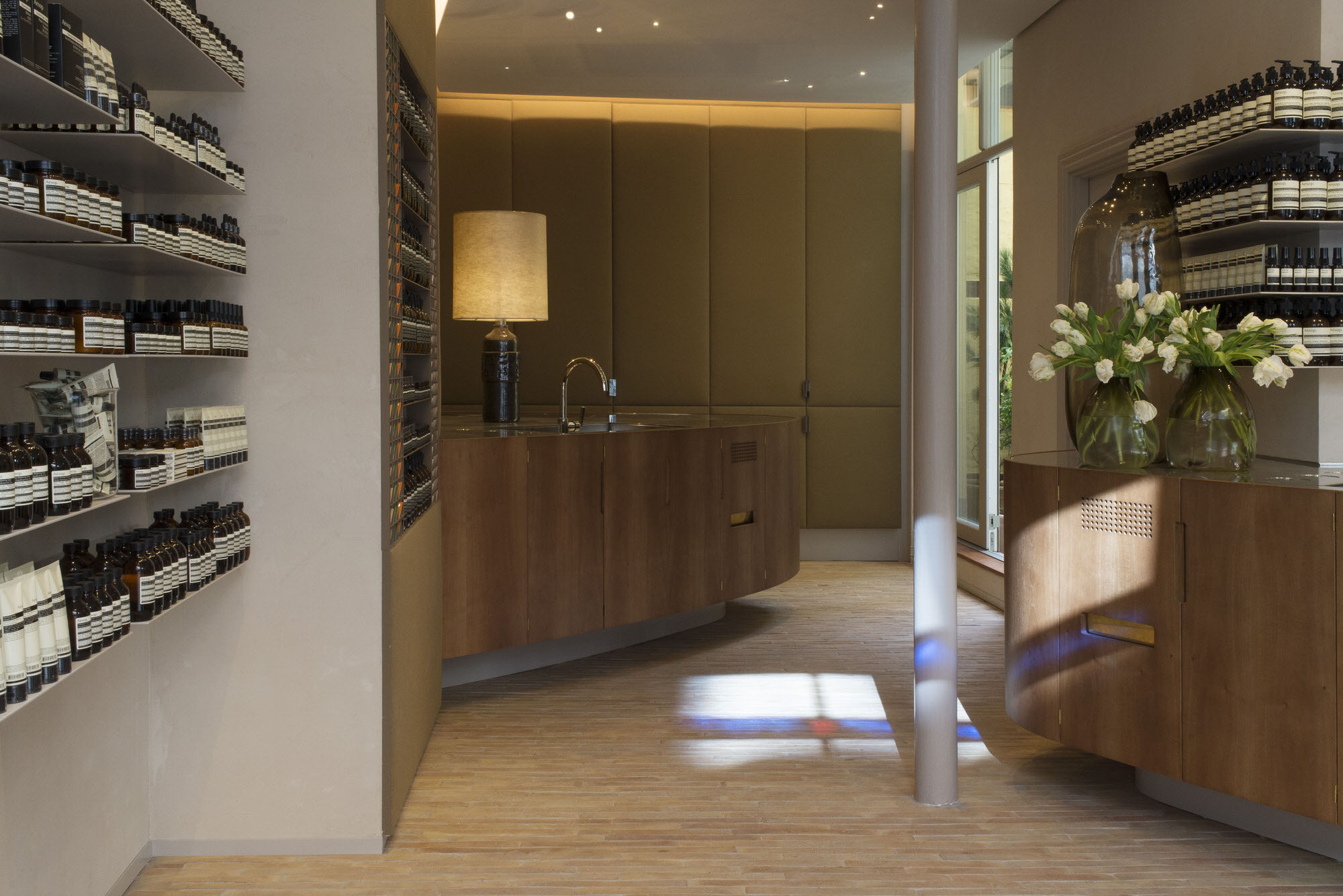 We acted as general contractor in collaboration with Munich’s 1zu33 Studio to realize yet another subtly elegant space for Aesop. Though our task was largely to manage and carry out the project, we had our hands on a few elements, such as integrating a heated air curtain into the ceiling, drawing and overseeing fabrication of the razor-thin shelving, and installing the coved ceiling with asymmetrical lighting arrangement, which despite being on the ground floor gives the illusion of daylight peeking through from above.