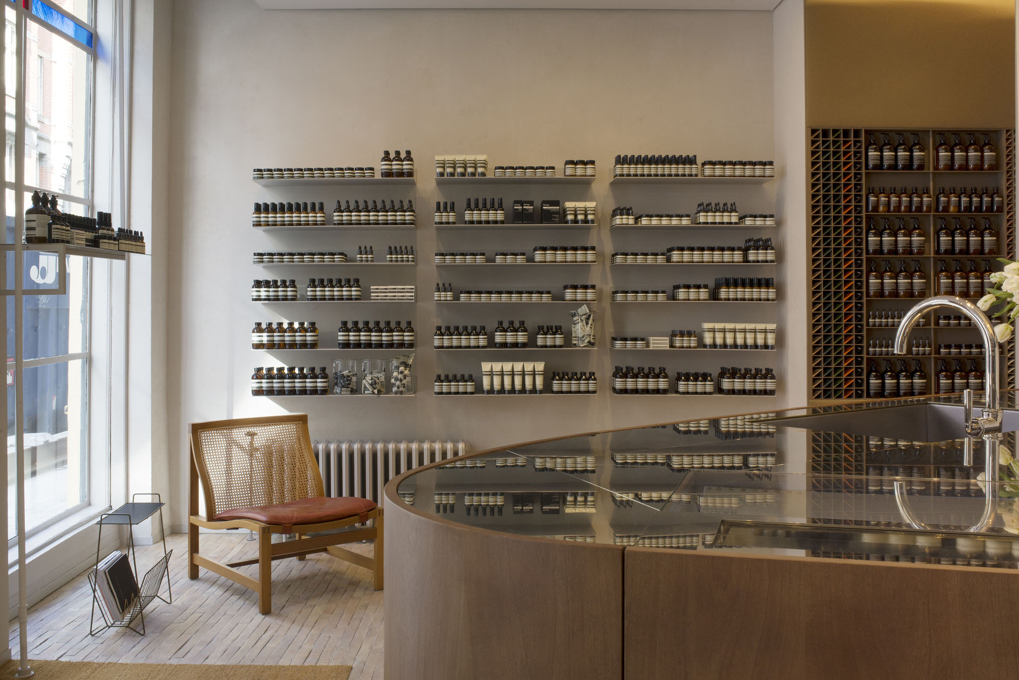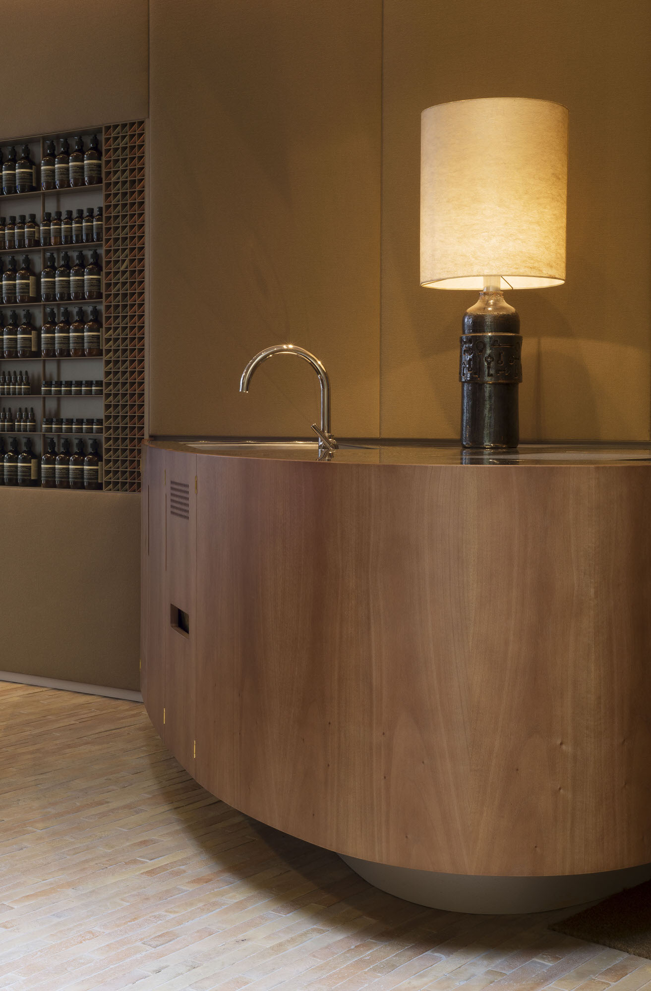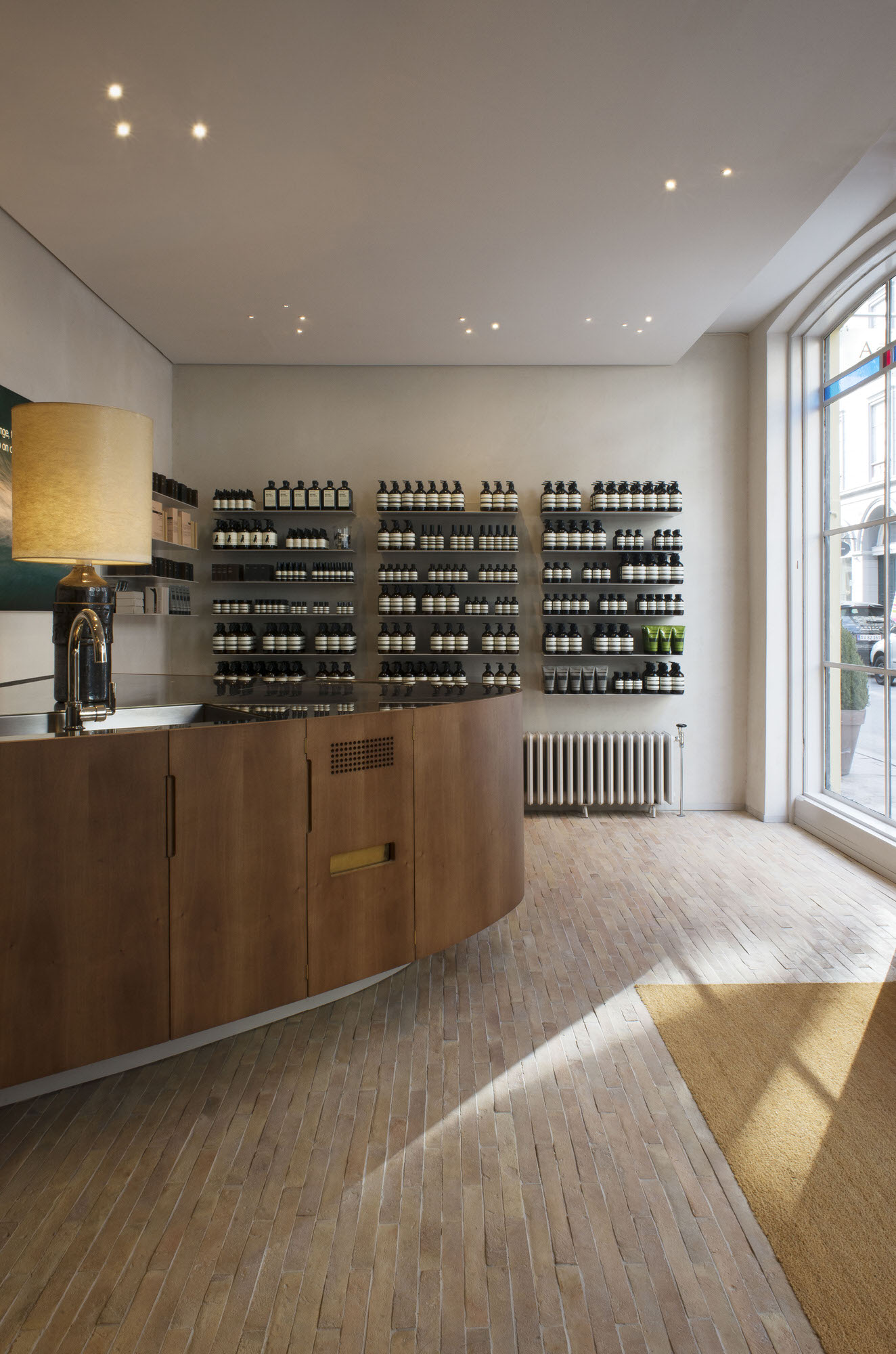 We acted as general contractor in collaboration with Munich’s 1zu33 Studio to realize yet another subtly elegant space for Aesop. Though our task was largely to manage and carry out the project, we had our hands on a few elements, such as integrating a heated air curtain into the ceiling, drawing and overseeing fabrication of the razor-thin shelving, and installing the coved ceiling with asymmetrical lighting arrangement, which despite being on the ground floor gives the illusion of daylight peeking through from above.