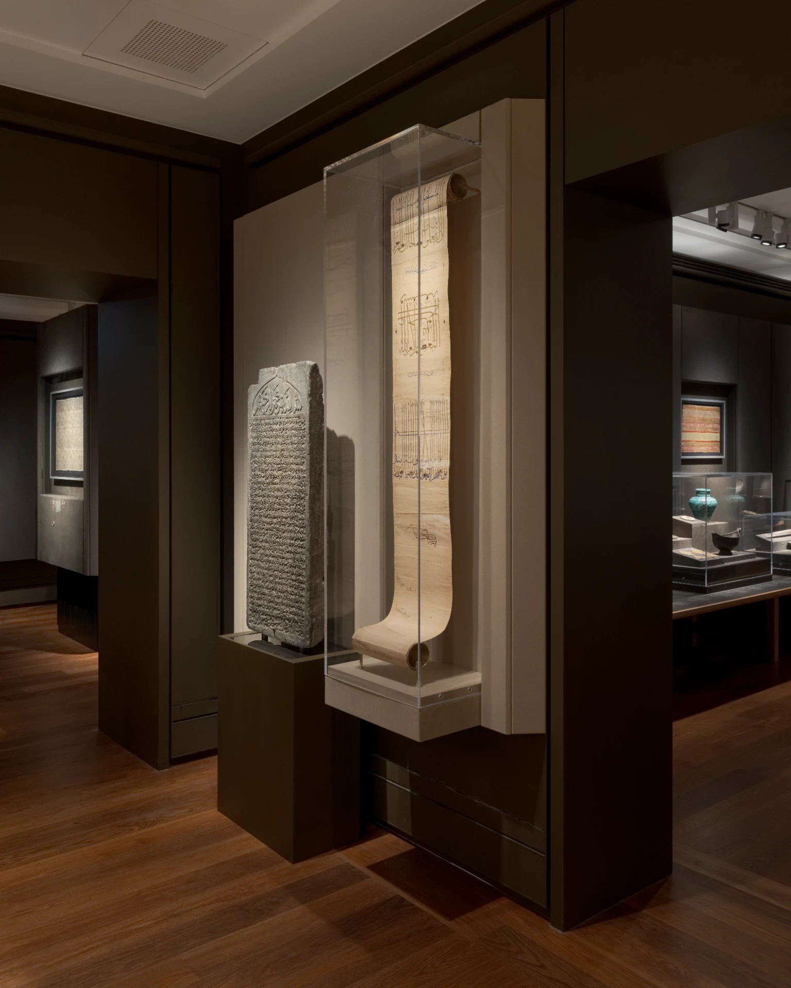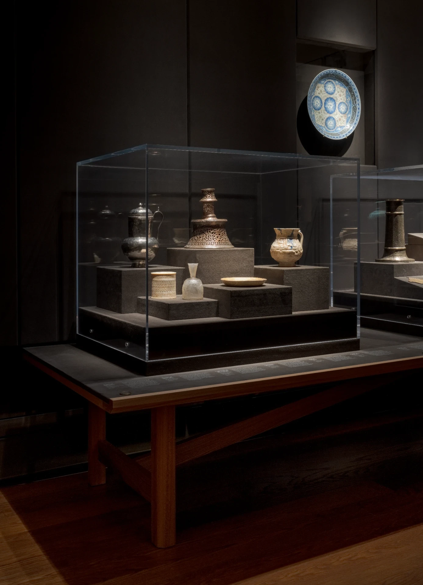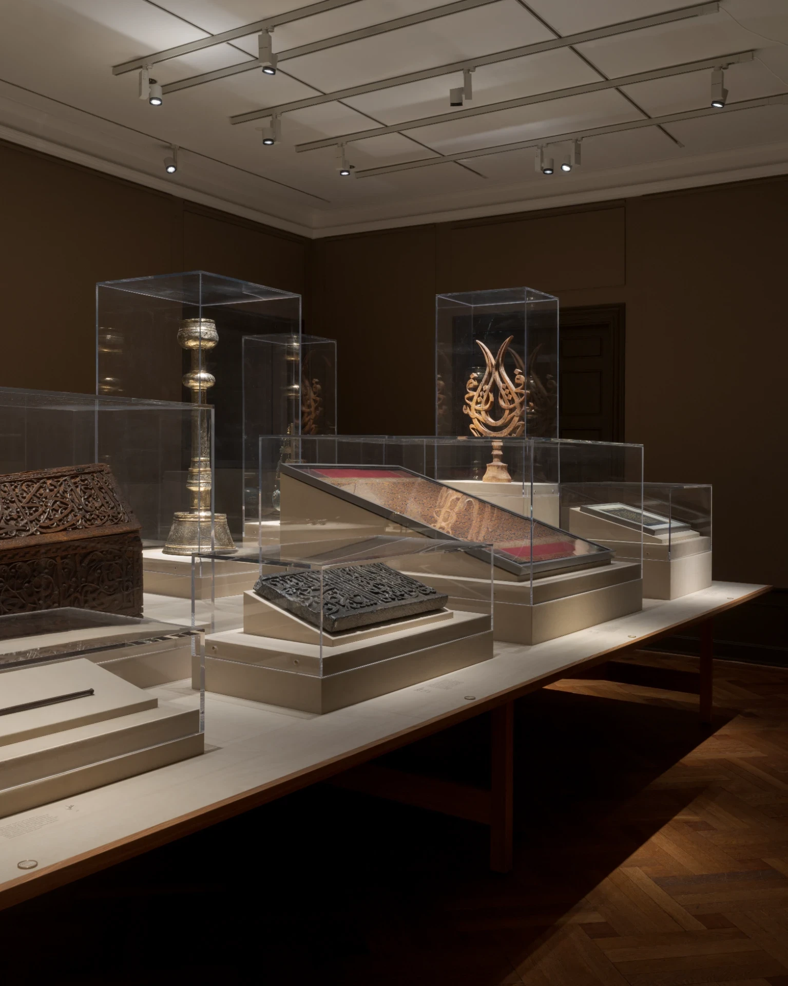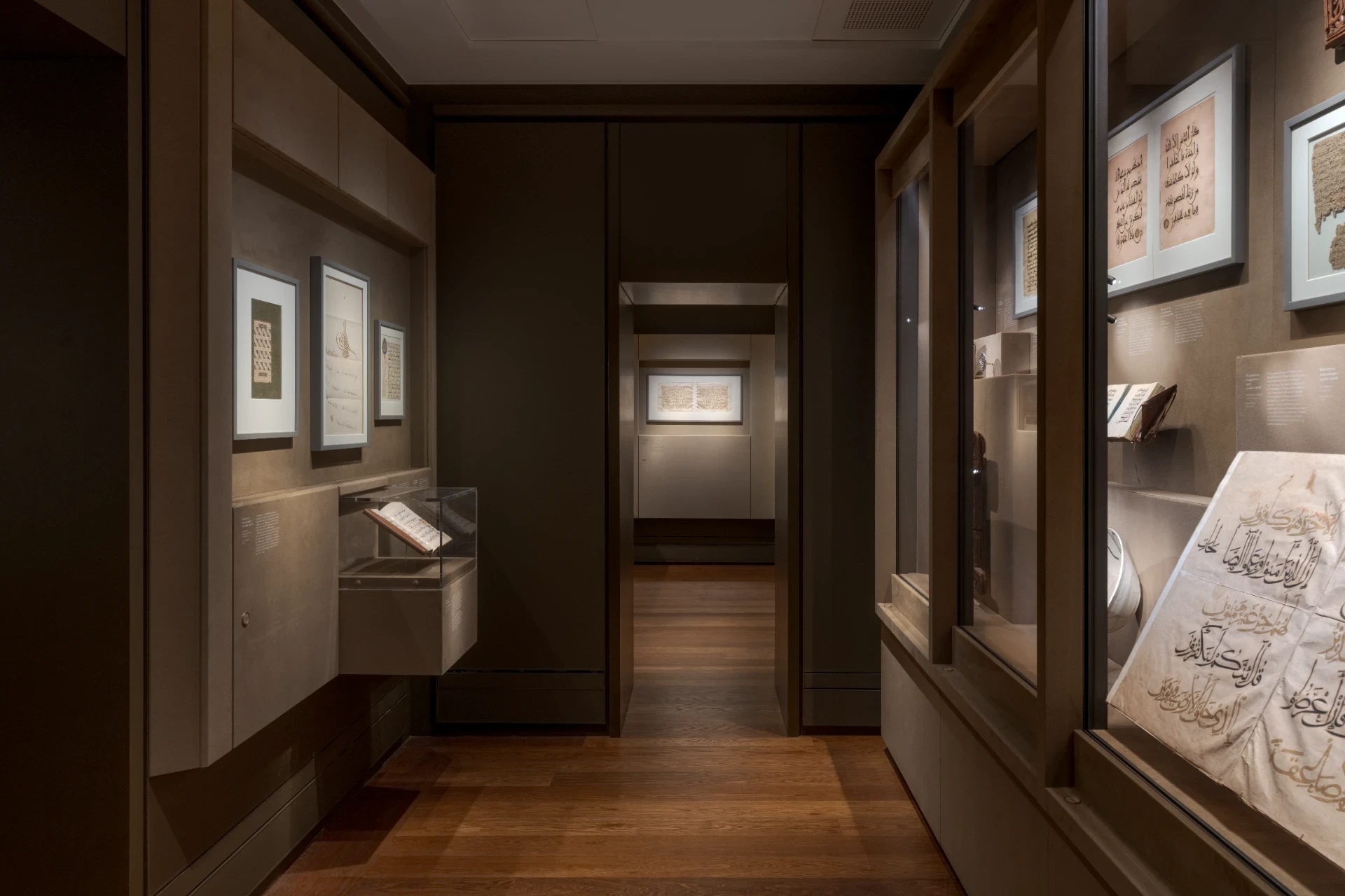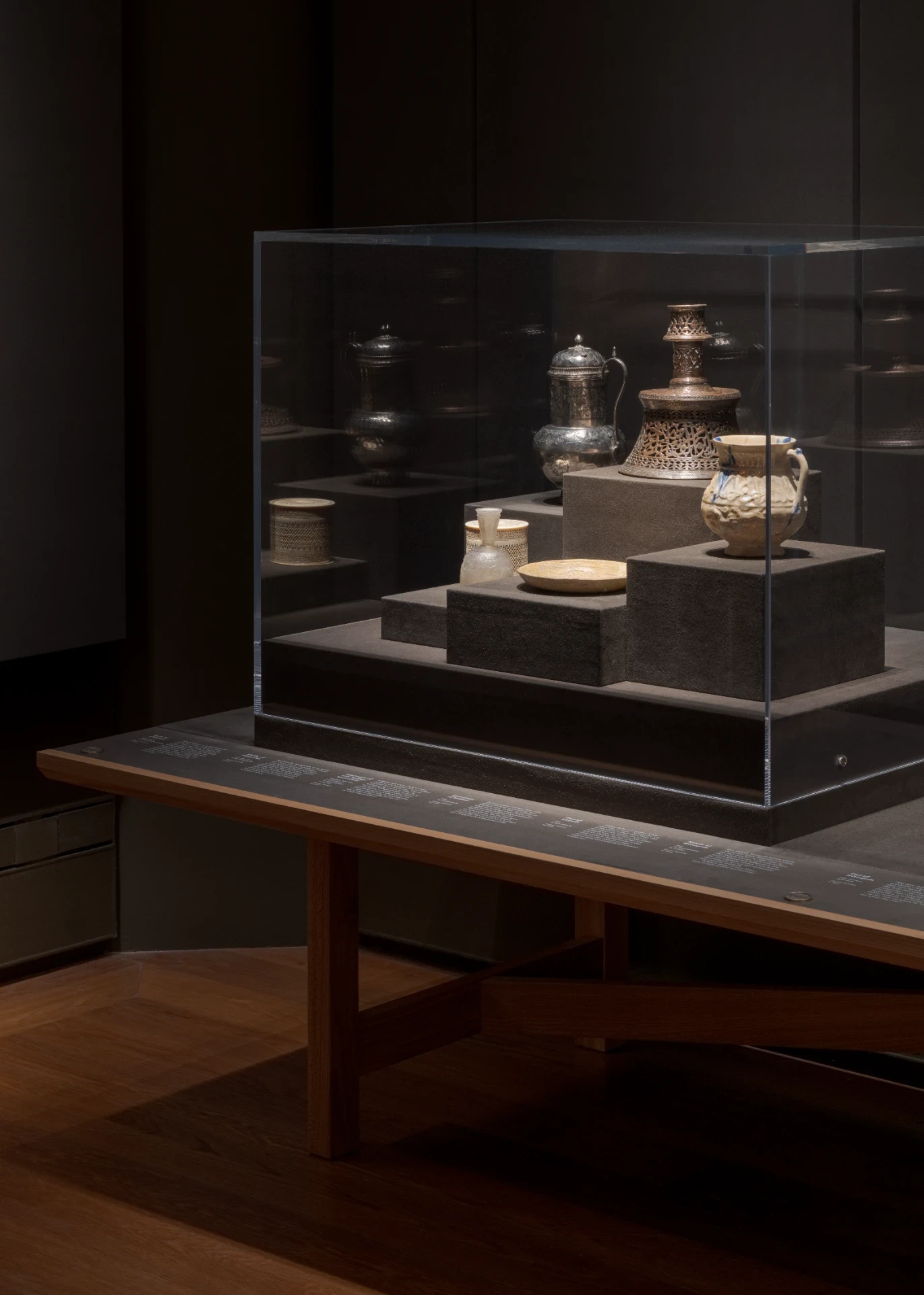 Boasting a table with the same area as a small bedroom, vitrines large enough to encase a standing woman, enough intricate printwork to fill volumes, and over 800 suedette panels, the simple sophistication of this space belies its grander aspects. A collaboration with Mentze Ottenstein architects, we detailed, built and installed this tenebristic exhibition of Arabic artifacts. Being one of the finest collections of Islamic art in the west, the challenge was to build around the highly rigorous material standards to uphold conservation and security. The soft luxury of the displays served as a worthy backdrop to the priceless pieces on display.