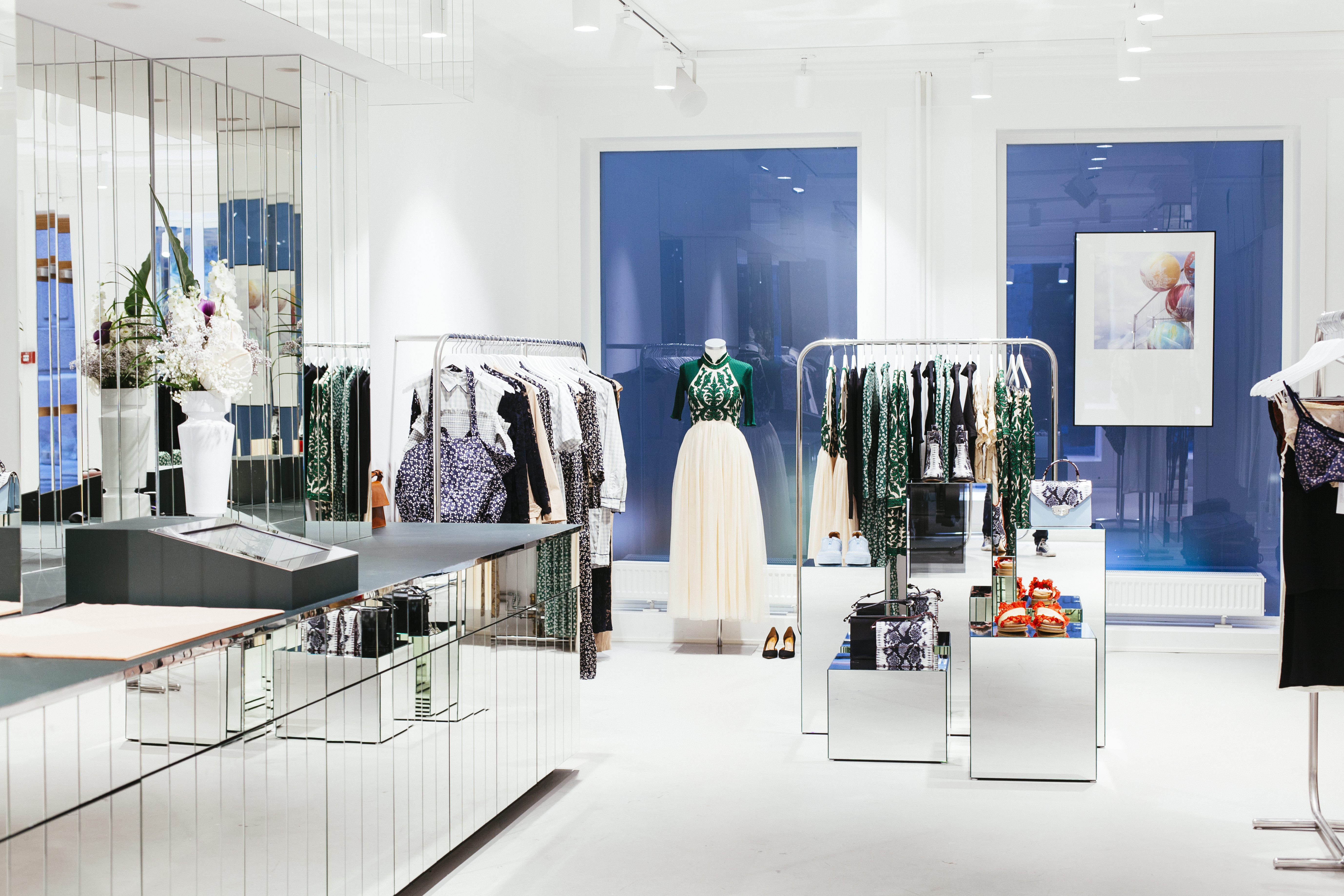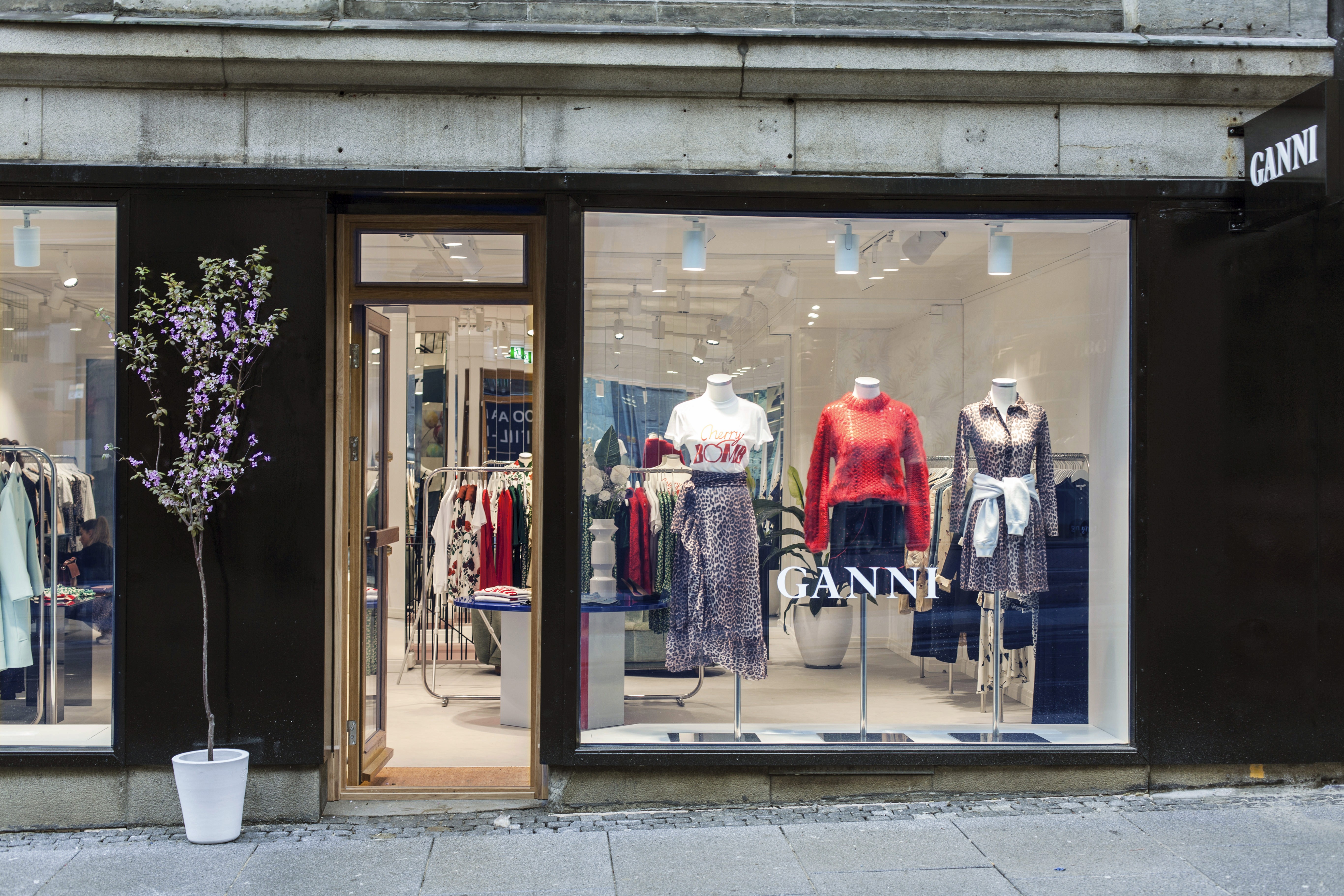 In the beginning of 2017, we made a flagship store for Ganni in Oslo, which until now is our largest project together. The store is centrally located on Upper Slottsgaten and is spread over two floors. It contains the characteristic Ganni elements such as mirror panels, hand polished steel stands and recognizable display tables, which are colorful round tables combined with new smoke-stained glass tables.