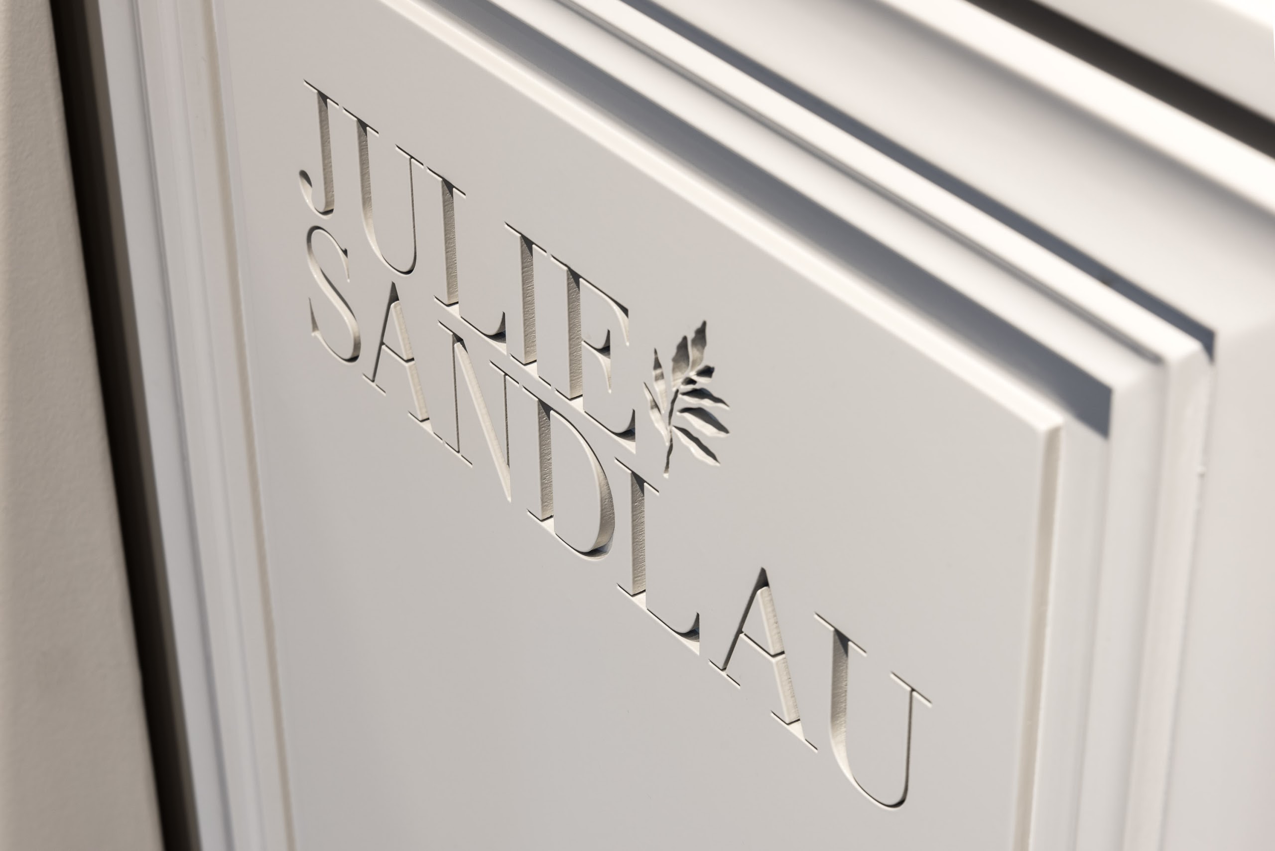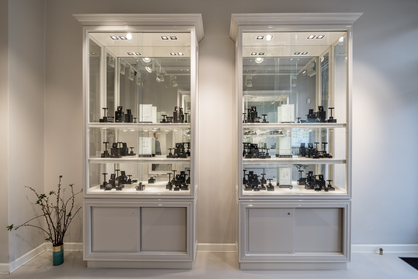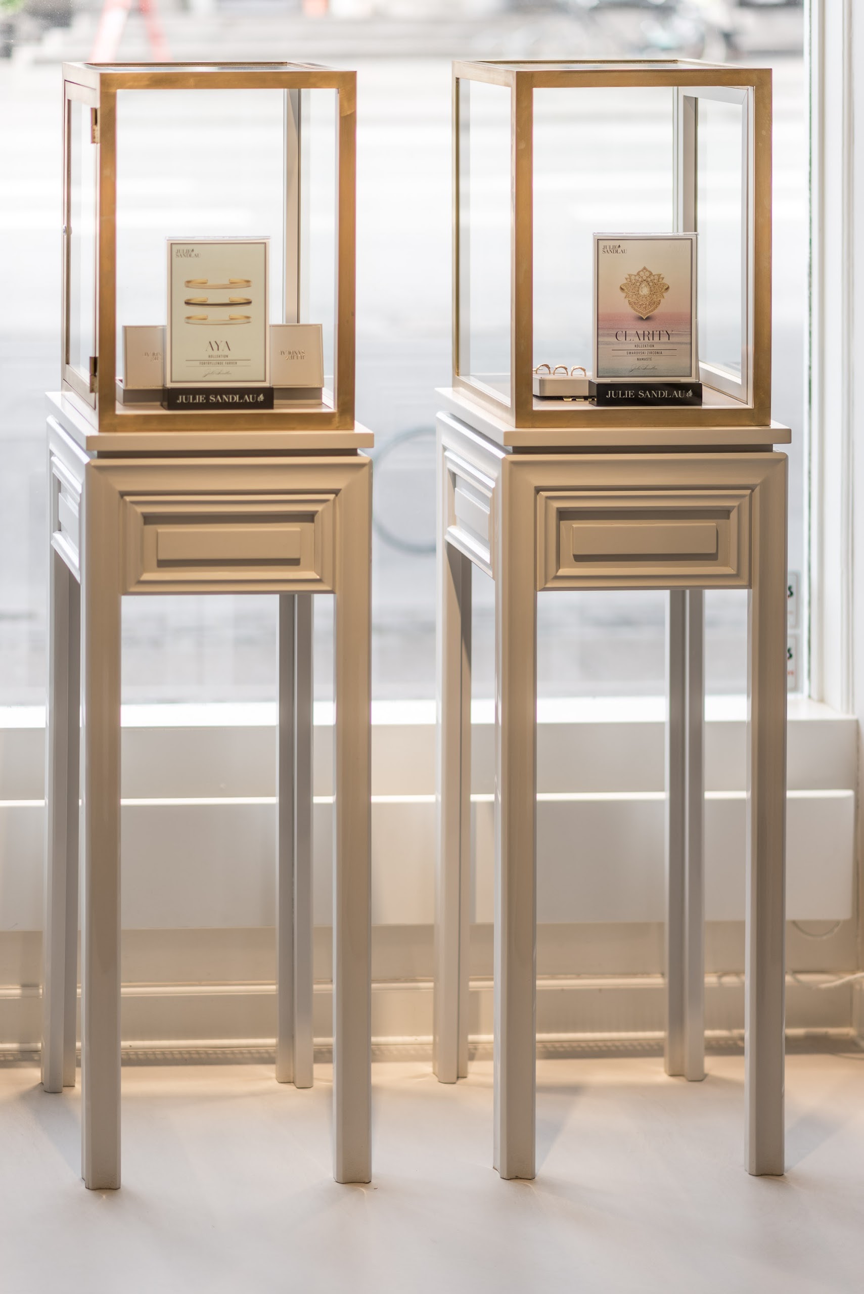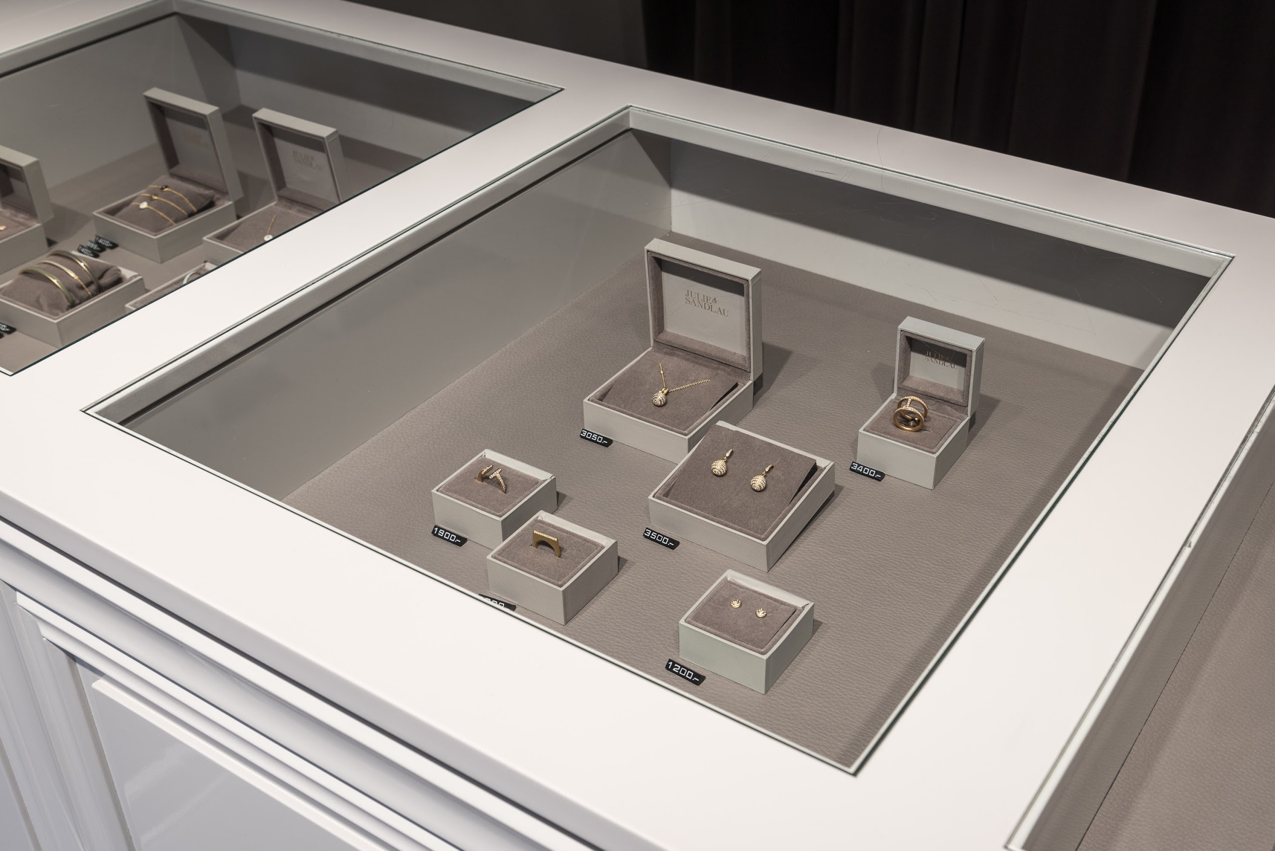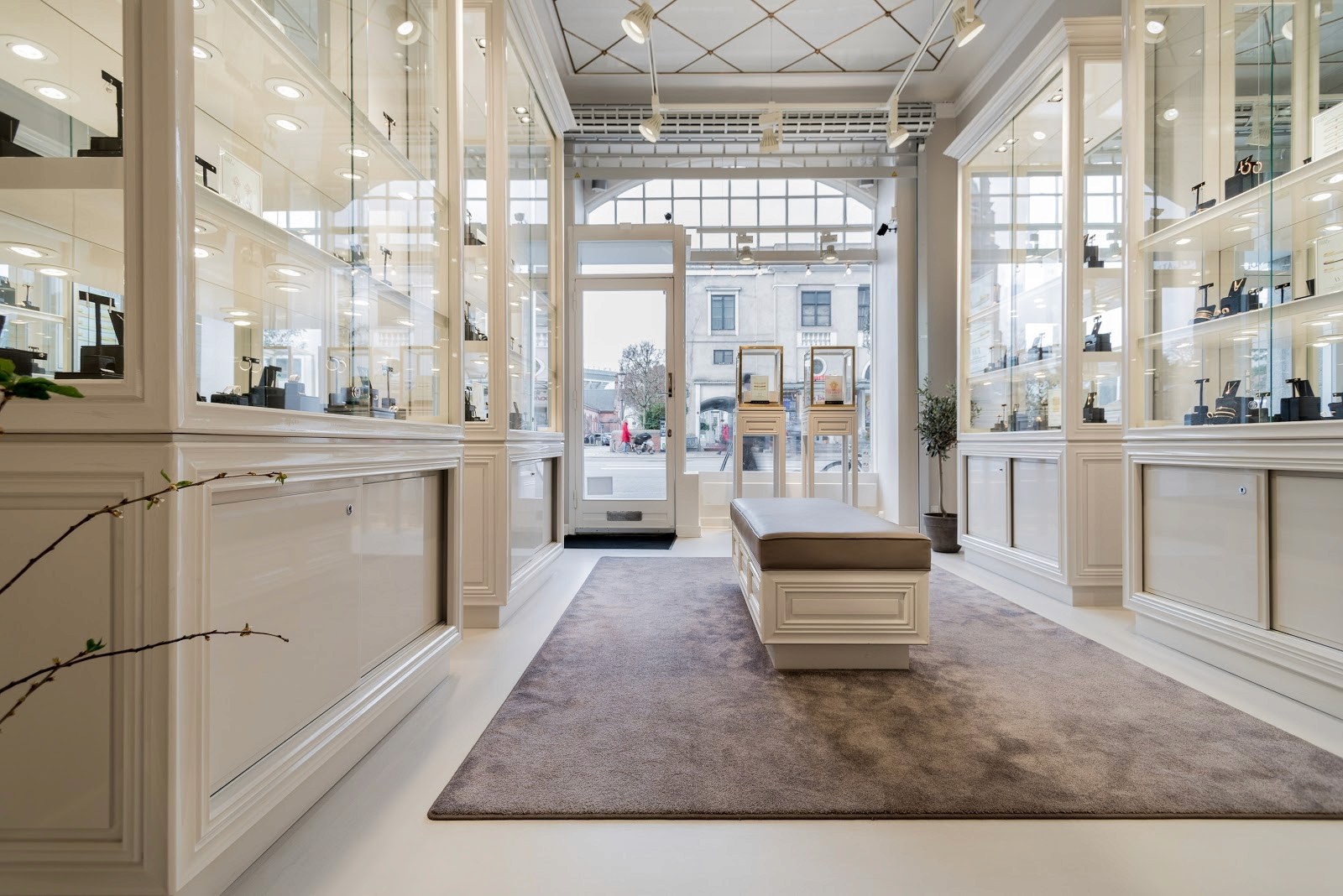 With great care, a store room located on Østerbrogade, which formerly housed a funeral shop, was transformed into an exclusive jewelry store. A submerged acoustic ceiling was removed and a fine French ceiling appeared. We restored the French ceiling and recreated the sophisticated and exclusive expression as background for the interior and the jewelry. The inventory was made with various indentations and subsequent high gloss paint. Ornamental decoration on the furniture creates a balanced frame to the jewelry of Julie Sandlau.