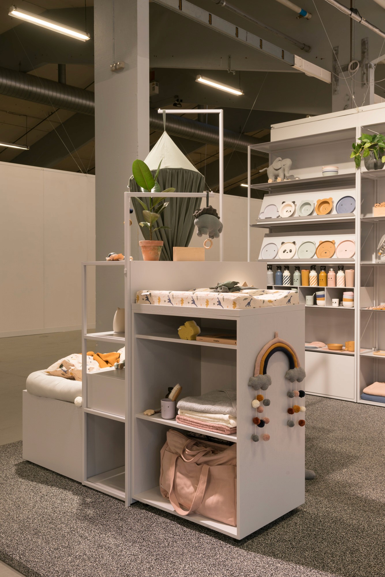Liewood is a brand working with children's clothing and accessories. Liewood wanted a new exhibition stand for the presentation of their new collection. We have designed a flexible shelving system, which can be mounted in various formations, in order to give Liewood the possibility of creating new layouts, using individual elements for an in-store, pop-up etc. Besides creating a flexible system, we have also designed removable inserts in wood to be mounted freely in the system. In order to further emphasize the brand, we chose to lay a rubber floor, which are associated to playgrounds. We have been working with the different textures of the materials and presented it all in a monochrome tone to show Liewoods products in the best possible way.