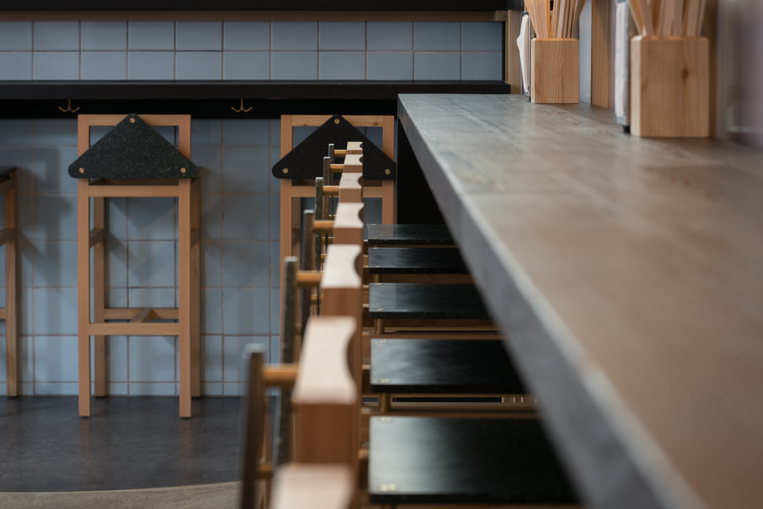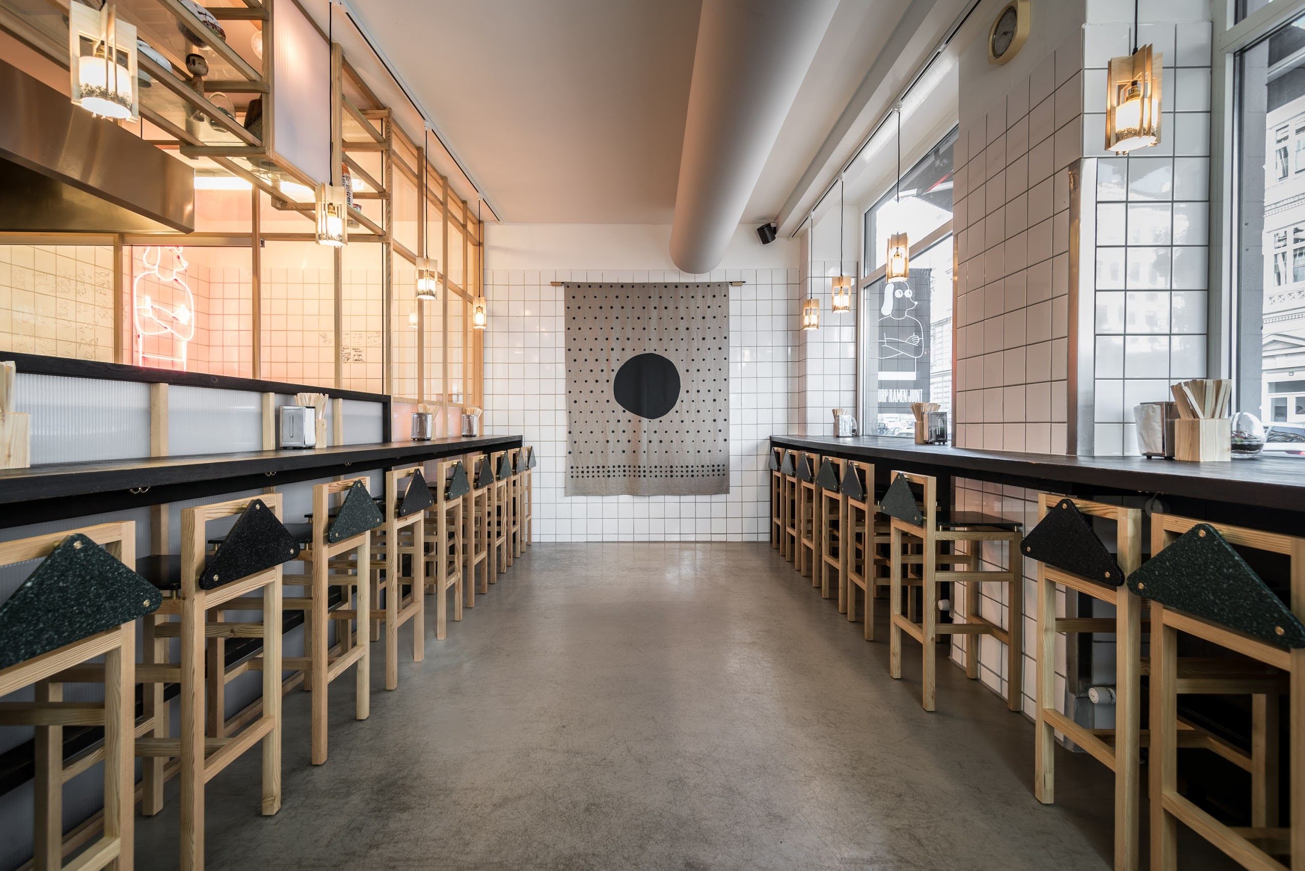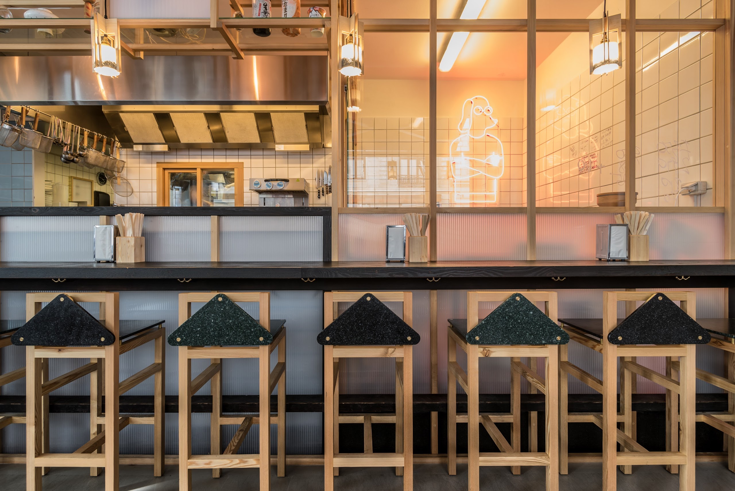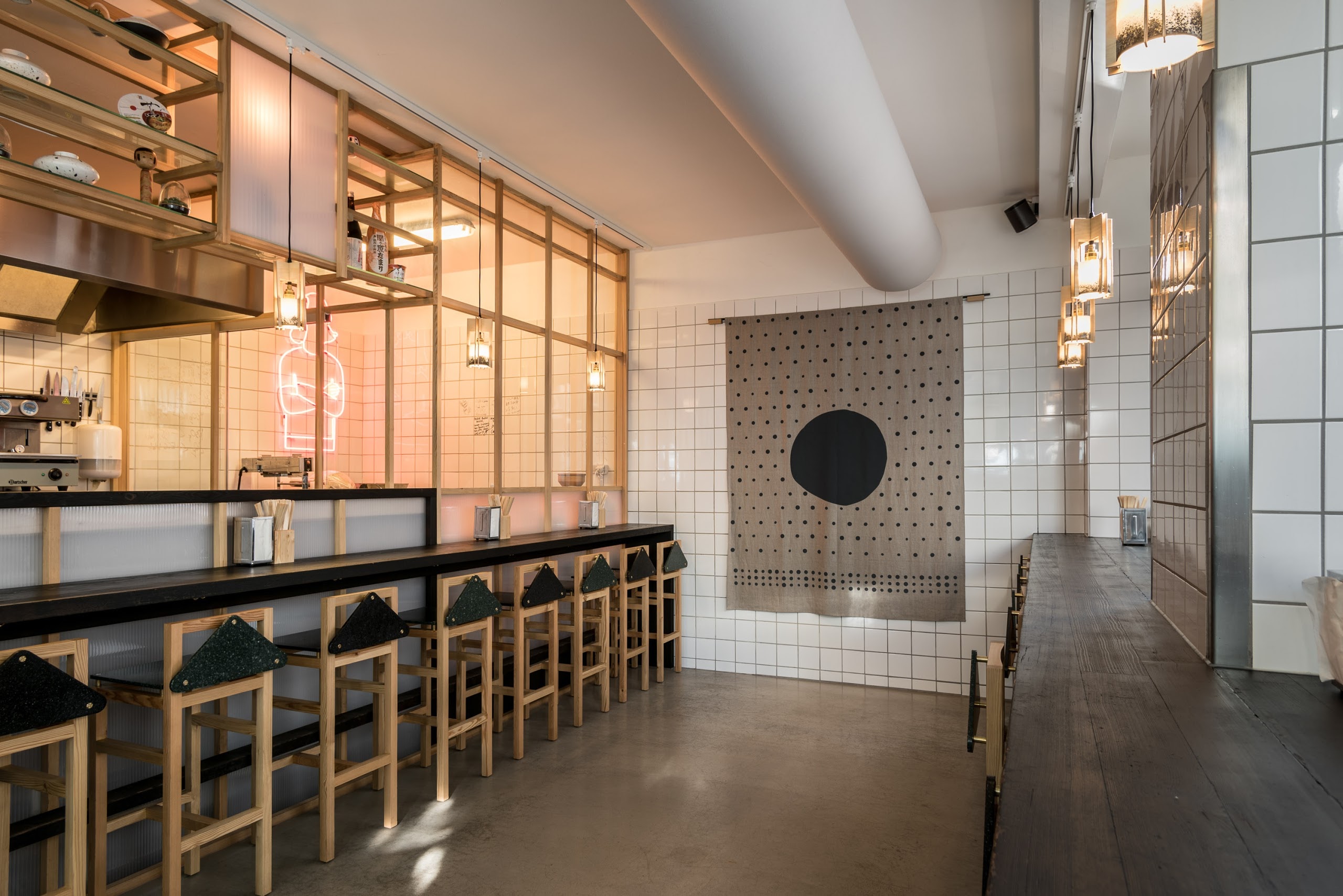 Barlby Carlsson has been the main contractor of the project and ensured that the architect's ideas were realized. All the interior is hand built and specially manufactured at our workshop and, among other things, we have used the traditional Japanese wood singeing technique, which burns the sugar substances out of the wood, so that microorganisms cannot thrive and at the same time the surface becomes beautifully black. A technique that was also used by the Vikings in their wooden house constructions. We used the technique on pine wood for the interior solutions at the Slurp Ramen Joint. Slurp Ramen Joint serves very ambitious ramen. A genuine Japanese noodle machine is incorporated in a well-designed and hand-crafted kitchen, allowing Slurp Ramen to produce their own noodles.