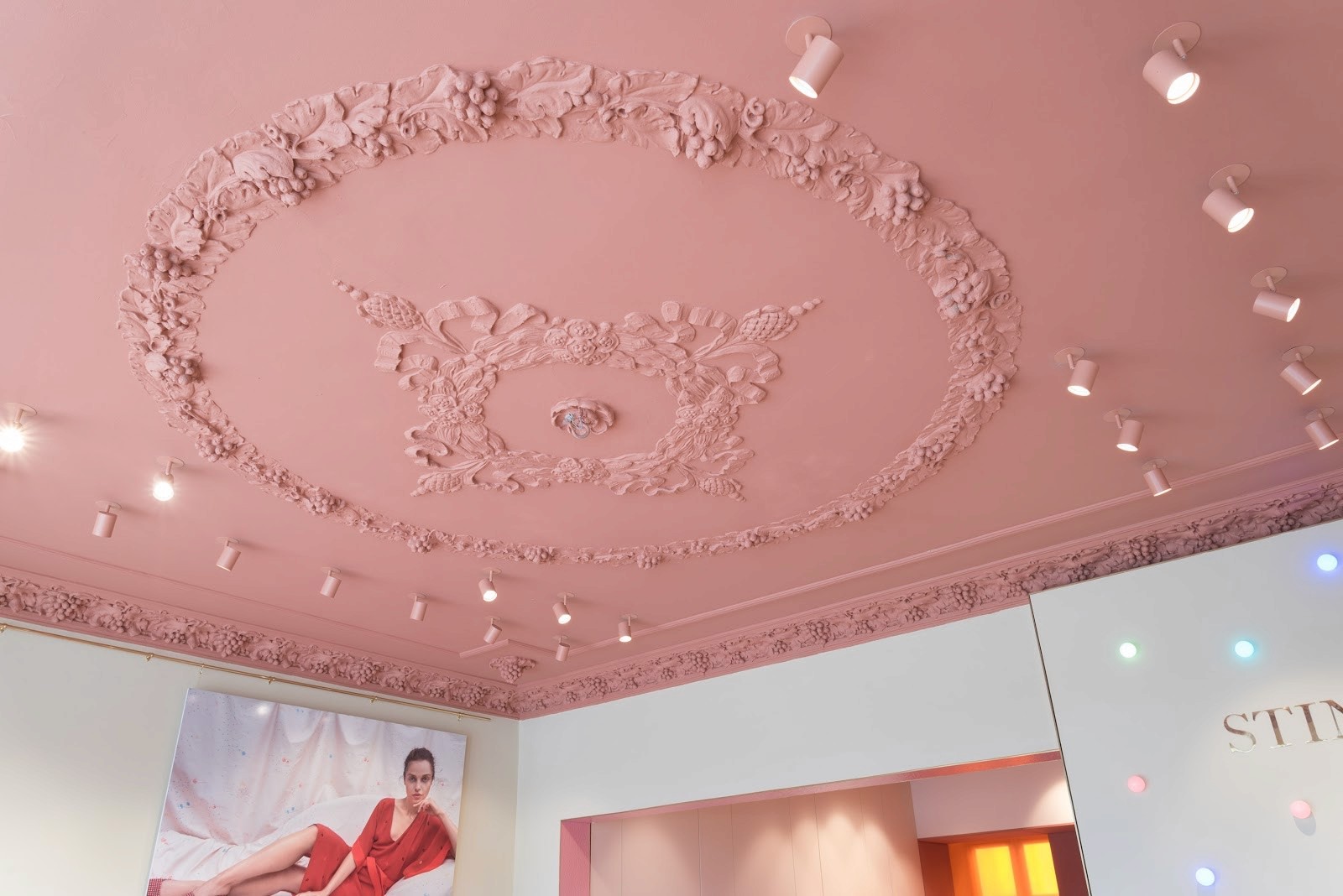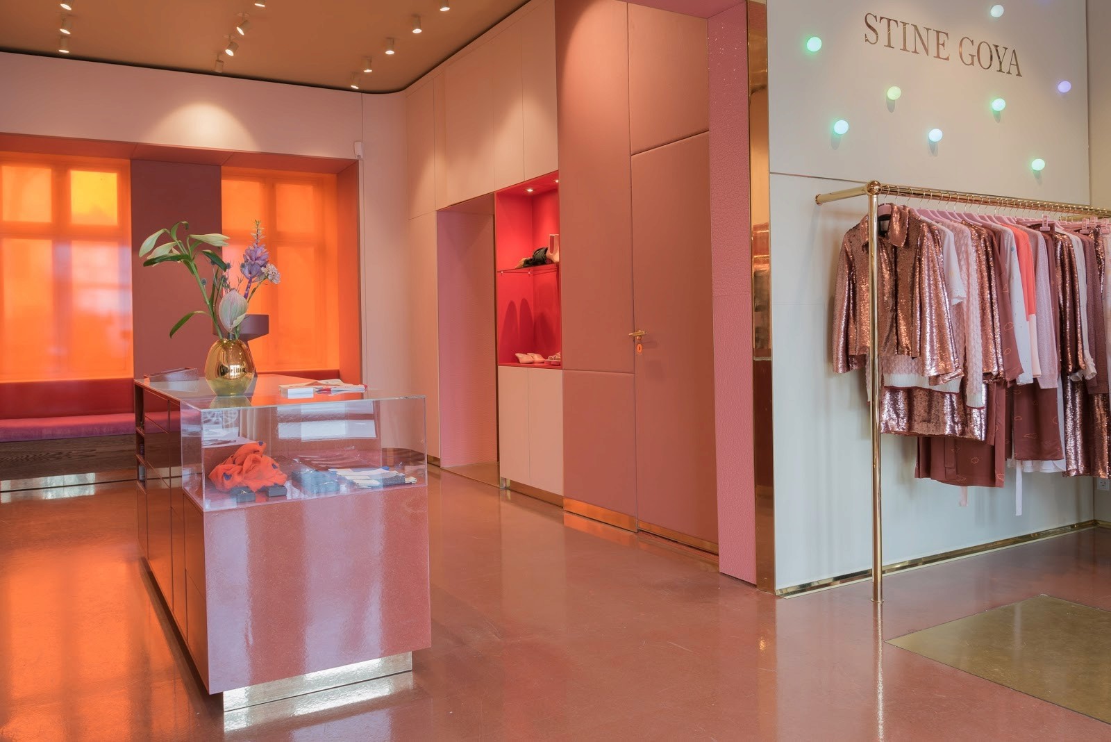 In close collaboration with fashion designer Stine Goya, we have tailor made and hand-crafted a flagship store, where Stine Goya's sense of shape, color and materiality is implemented in the interior design, expressed in textile coated wall surfaces and passages made in painted raw glass combined with a custom made colored concrete floor with metallic effects. The shining references are also expressed in the skirting boards and the clothing racks made in brass complimenting the carefully adjusted color scheme. All in perfect match with sculptural and feminine expression of Goya.