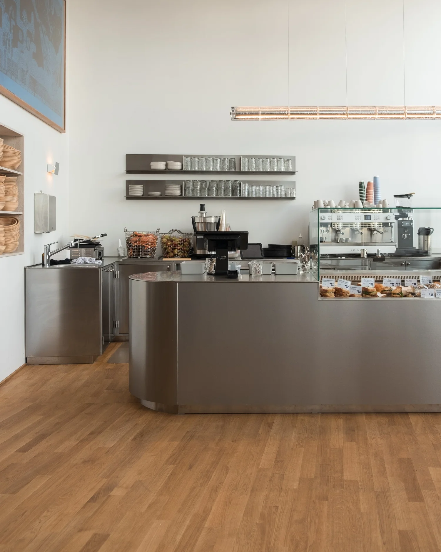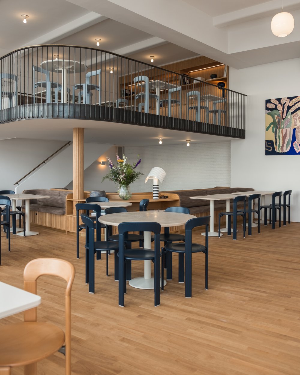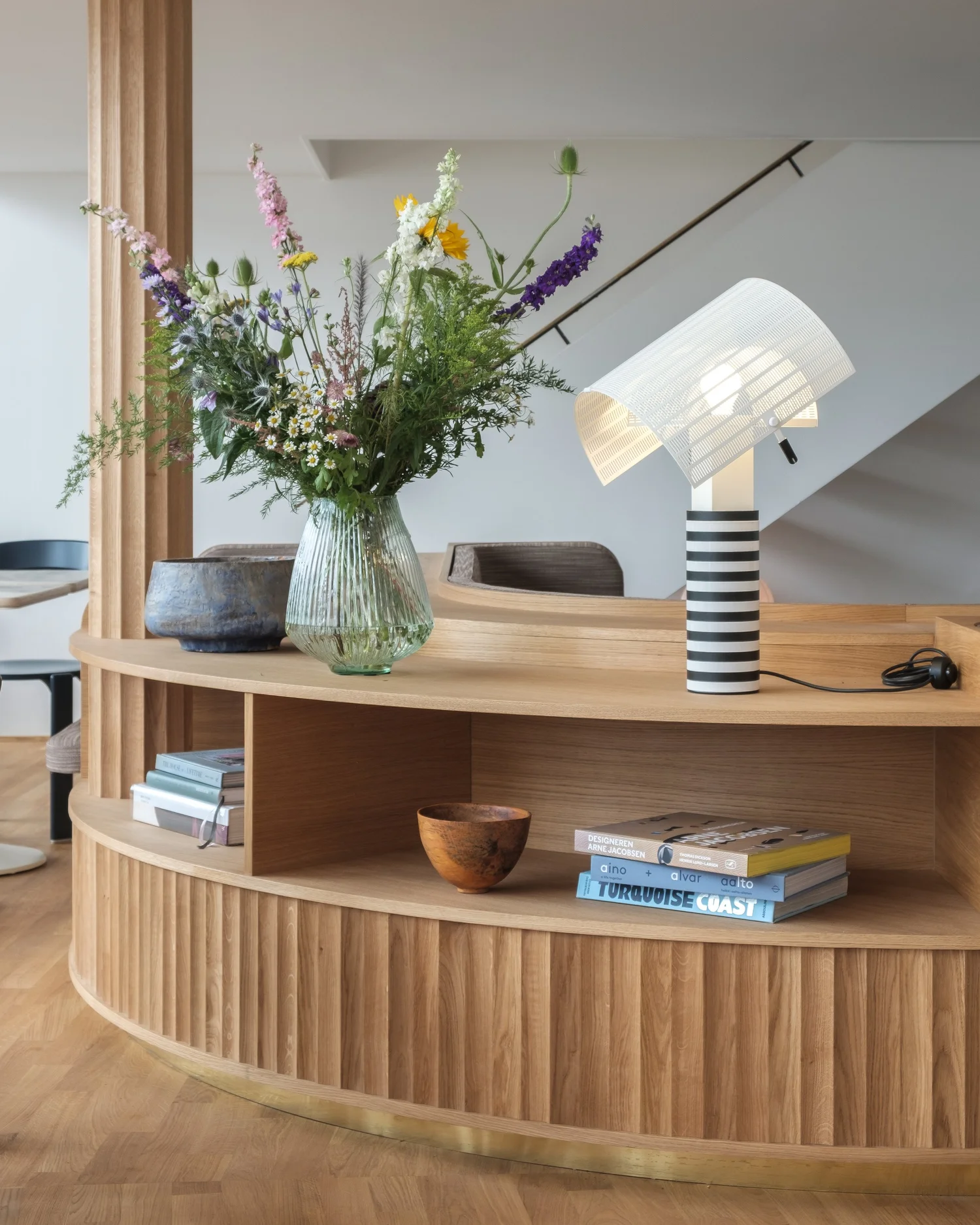 Located in the Arne Jacobsens Bellevue Teatret, this cafe interior aimed to subtly honor the iconic designer’s work. We designed and built a significant amount of shelving, seating and a welcoming, warming vestibule. The graceful curves of the wrap-around seating pay tribute to the building’s design heritage, while fluted solid-wood columns, and luxurious Kvadrat textile adding soft accents to the light-filled space.