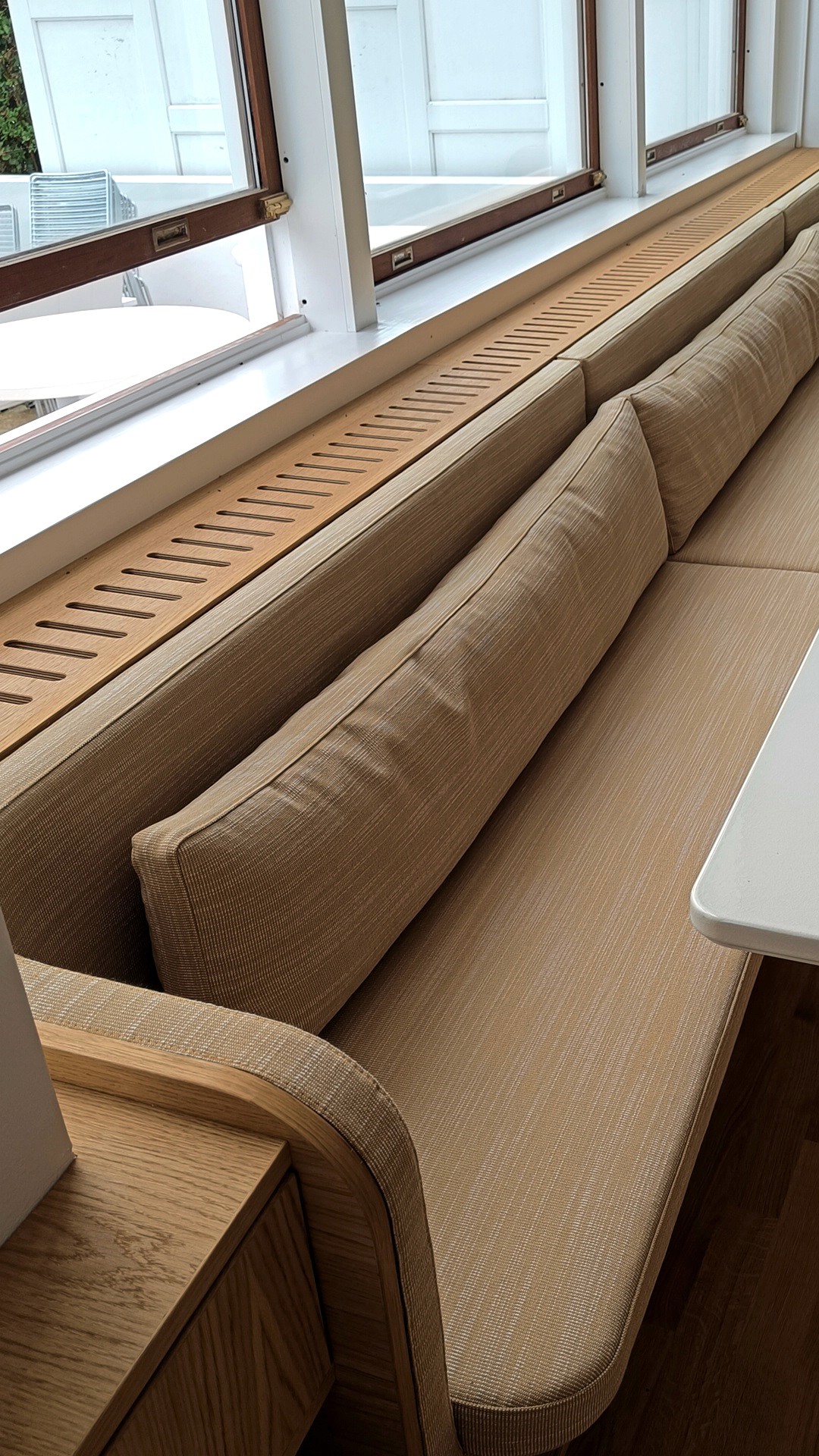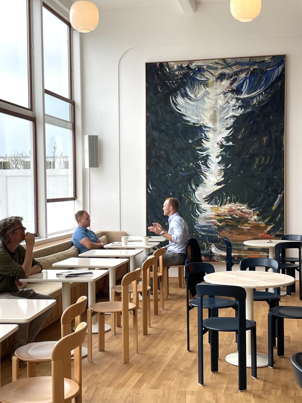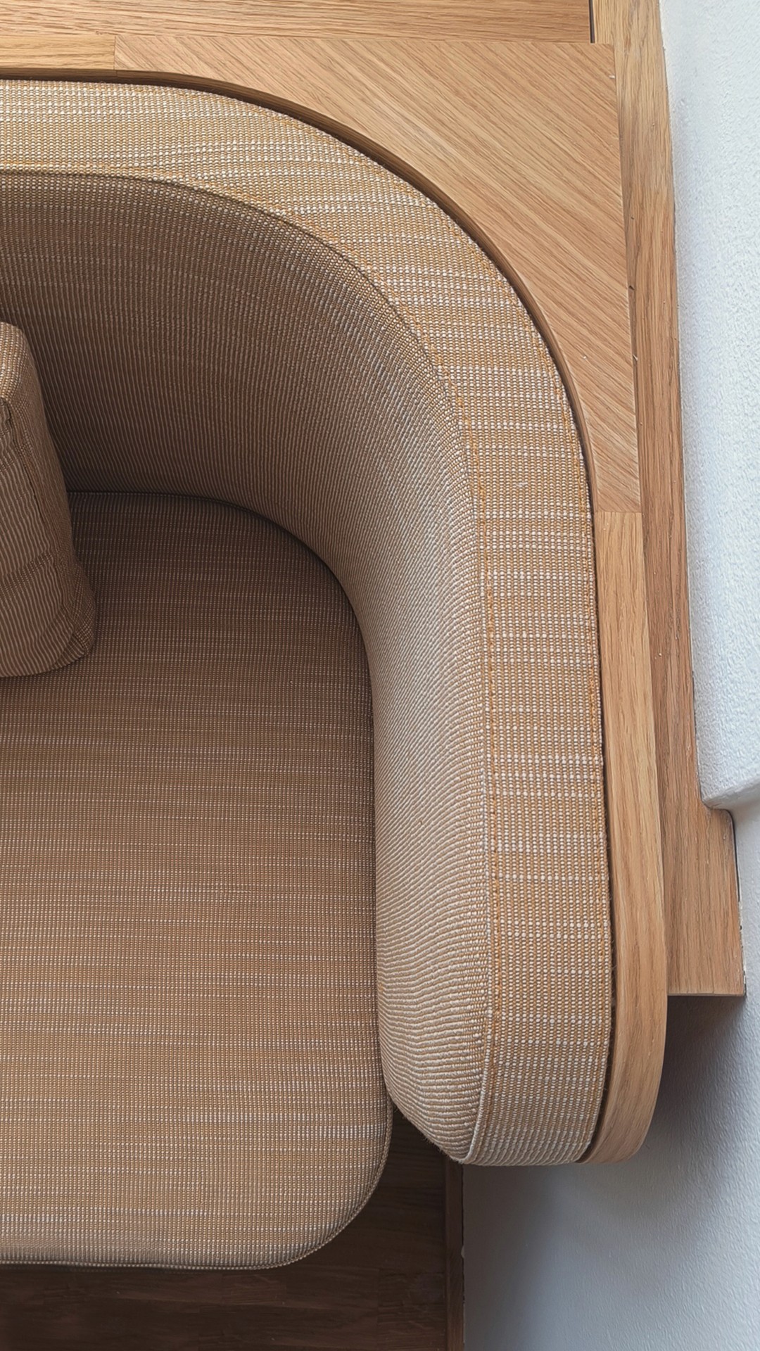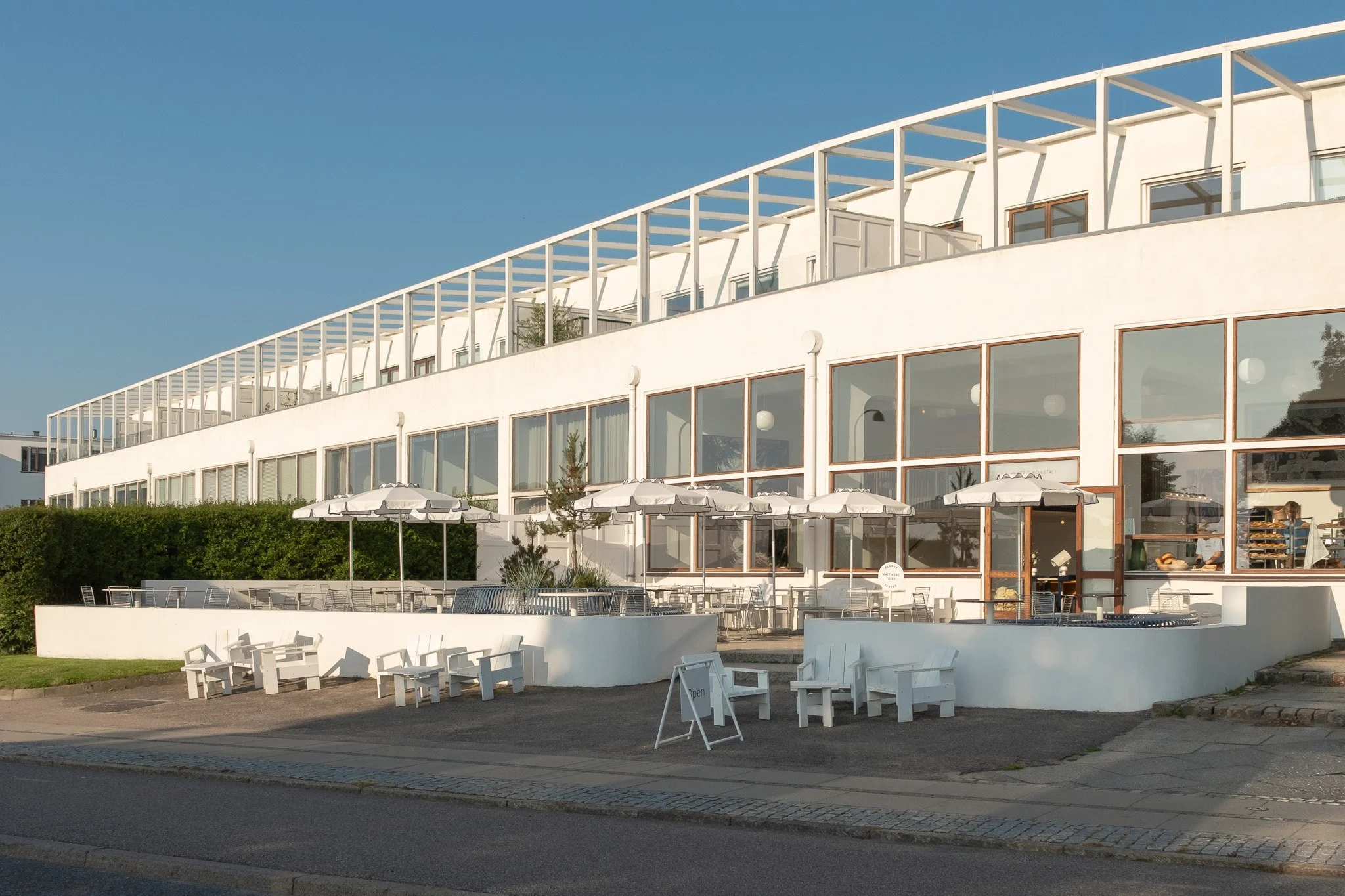 Located in the Arne Jacobsens Bellevue Teatret, this cafe interior aimed to subtly honor the iconic designer’s work. We designed and built a significant amount of shelving, seating and a welcoming, warming vestibule. The graceful curves of the wrap-around seating pay tribute to the building’s design heritage, while fluted solid-wood columns, and luxurious Kvadrat textile adding soft accents to the light-filled space.